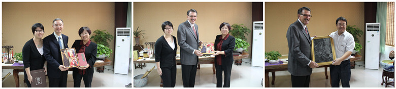 座谈会后,双方互赠礼物并合影留念。随后,代表团一行还在院领导的陪同下参观了建筑系、博学园等地。当天下午,美国南伊利诺伊斯大学应用科学与艺术学院院长王飓安教授还在科报厅为计算机工程系学生带来题为《计算机的巨大挑战与成功的关键》的讲座,应用科学与艺术学院建筑学院主任沃尔特·温德勒教授在图书馆音乐厅为建筑系学生带来题为《21世纪的建筑教育》的讲座。