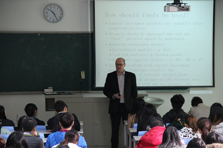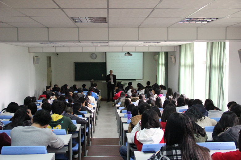 麦克•波奇老师此行于机北201教室为咕咕番 学生讲授了一堂名为《Issues in Finance》的示范课。在将近1个小时的纯英文授课过程中,波奇老师深入浅出的阐述了金融领域的重要基础知识,辅以若干金融市场实时数据进行例证,现场学生均充分感受到原汁原味的英国南威尔士大学商科专业授课方式。