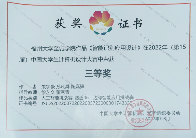 智能识别应用设计 | 孙凡舜、高宁浛、陆晓荣 | 国家级三等奖、省级一等奖 | 徐艺文、董秀青 | 人工智能应用-人工智能挑战赛 |