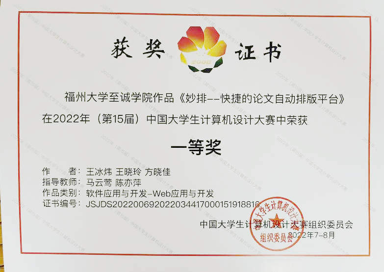 妙排--快捷的论文自动排版平台 | 王冰炜、王晓玲、方晓佳 | 国家级一等奖、省级一等奖 | 马云莺、陈亦萍 | 软件应用与开发-Web应用与开发 |