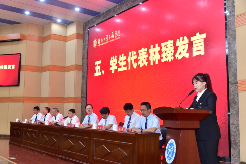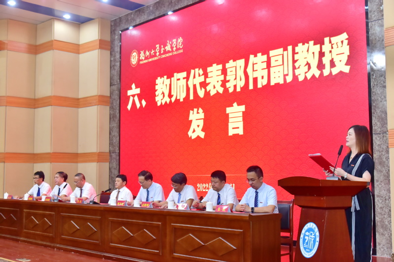 仪式后,学生代表林臻同学和教师代表郭伟老师先后上台发言。林臻同学代表全院同学表达了对老师们的感恩与祝福。郭伟老师回顾了自己在学院十八年来的工作经历,表达了对学院的感激之情,并号召全院教师坚守教育报国初心、担当筑梦育人使命,秉承校训、服务至诚,挑重担、讲奉献,为加快建设有特色高水平的应用型大学贡献智慧与力量。