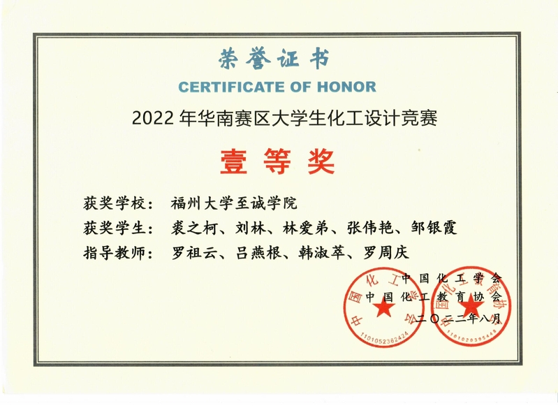 日前,2022年“天正设计杯”第十六届全国大学生化工设计大赛决赛结果公布。咕咕番 化学工程系学子在比赛中取得优异成绩:由裘之柯、刘林、林爱弟、张伟艳、邹银霞5位同学组成的“醇属意外”团队(指导老师:罗祖云、吕燕根、韩淑萃、罗周庆)荣获华南赛区一等奖暨全国二等奖;由谢若纯、陈梦秋、李浚涛、林雯婷、吴爱玲5位同学组成的“醇粹不想掉队”团队(指导老师:罗祖云、吕燕根、韩淑萃)荣获全国三等奖。