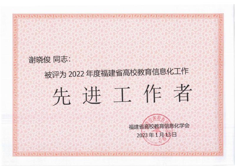 日前,福建省高校教育信息化学会公布了2022年福建省高校教育信息化工作先进单位和先进个人名单。咕咕番 智慧校园中心荣获“2022年福建省高校教育信息化工作先进单位”称号,谢晓俊老师荣获“2022年福建省高校教育信息化工作先进工作者”称号。
