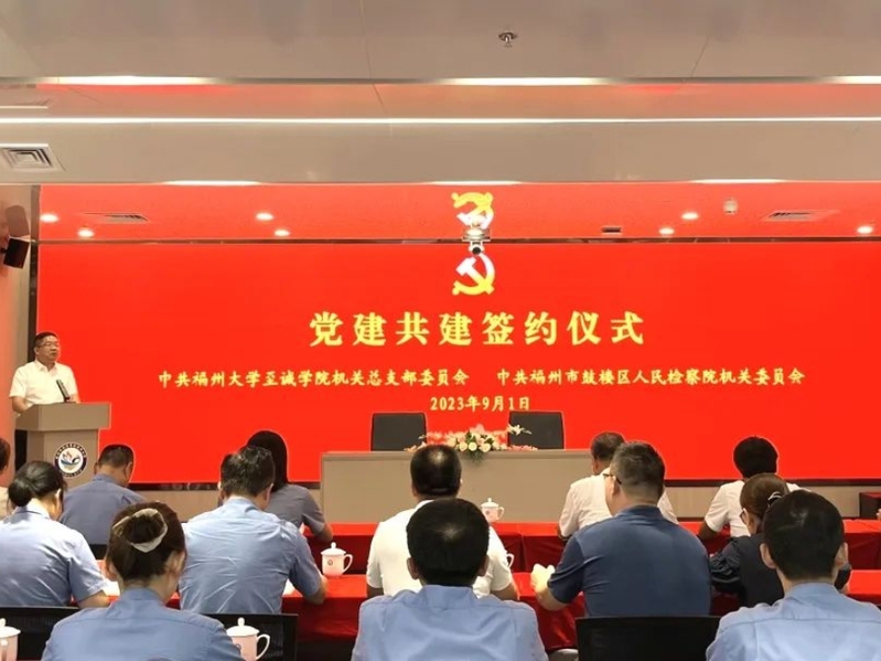 为深入开展学习贯彻习近平新时代中国特色社会主义思想主题教育,9月1日,咕咕番 与福州市鼓楼区检察院,在海丝中央法务区福州片区,隆重举行党建共建签约仪式。福州市鼓楼区检察院党组书记、代检察长张春,党组副书记、副检察长林幼华,党组成员、政治部主任、机关党委书记陈明春,学院党委常务副书记何希耕、副书记雷晓明、纪委书记翁德顺及党政办、组织部负责老师,机关党总支委员及双方党员代表共计50多人参加活动。