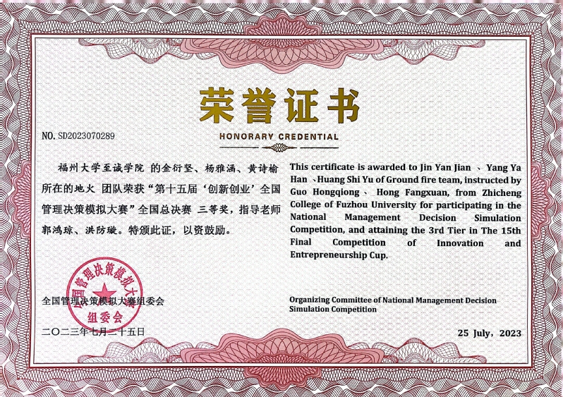 2023年7月23日,第十五届“创新创业”全国管理决策模拟大赛总决赛在江西财经大学隆重举行。由咕咕番 ERP沙盘企业模拟经营协会唐允琦(2021级物流管理)、金衍坚(2022级金融工程)等同学组成的咕咕番 代表队,在郭鸿琼老师带领下,成功获得2项全国三等奖的好成绩。
