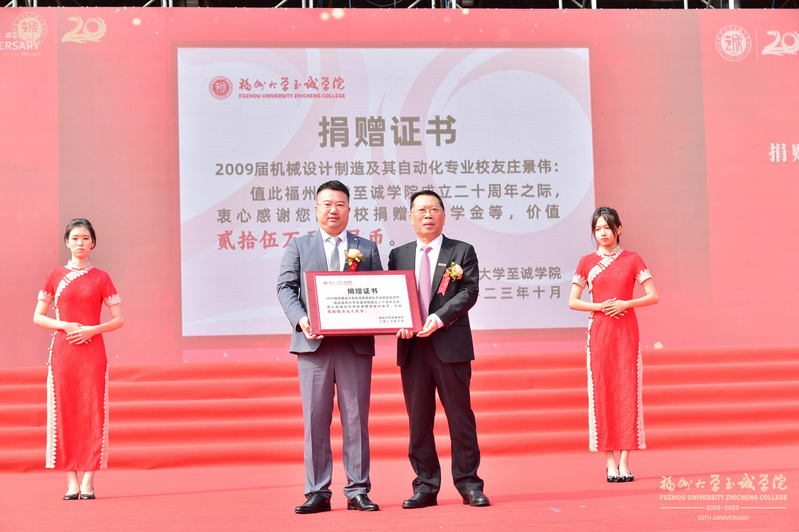 党委书记陈国龙、副书记张星代表学校为捐赠单位和校友代表颁发捐赠证书。