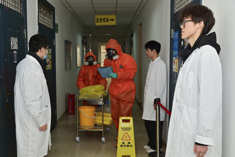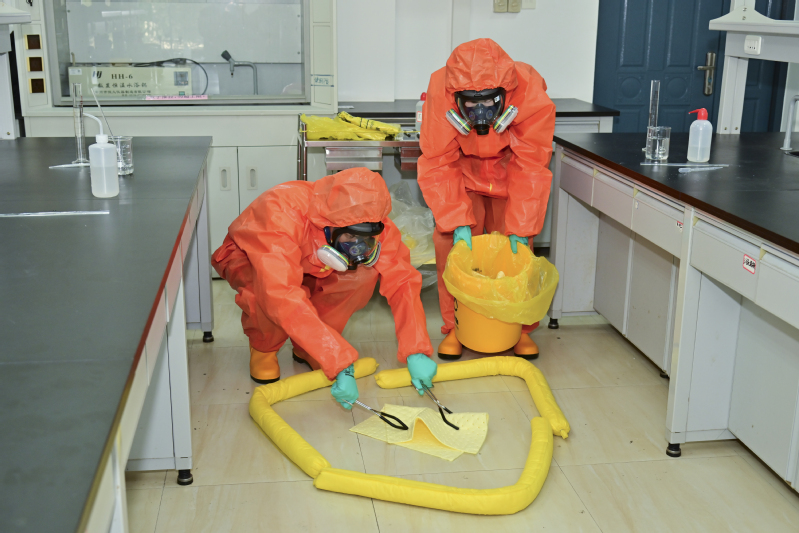 此次演练以实验课中打破浓硫酸为活动背景,由化学工程系张书泉老师带领他的学生们参与应急处置演练。演练过程中,各组成员密切配合,各司其职,按照有序撤离、现场封锁、事故上报、危害评估、应急救援人员个人防护、应急处理、消除危险源、现场恢复等应急处置流程,有步骤、有秩序地开展演练活动,真人实景呈现了“汇报-疏散-防护-询情-泄漏处理-恢复使用”一套完整的危化品泄漏应急处置全过程。此次演练活动,有效地将实验室安全知识和实地操作相结合,增强广大师生的实验室安全意识,提高紧急情况下的应急处置能力,进一步筑牢实验室安全防线。
