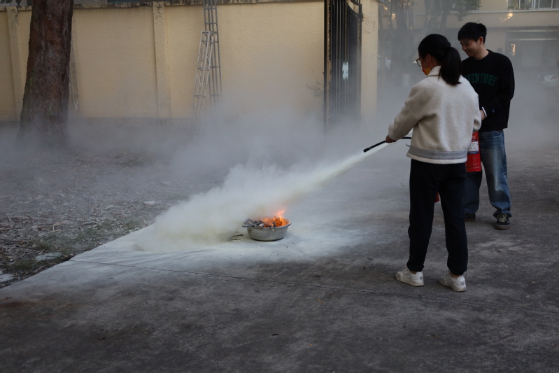 讲座当日,消防安全演练随后在第二实验实训中心后楼展开,保卫部刘德荣等相关老师到现场参加并指导。刘老师向师生详细介绍灭火器的使用方法、适用范围、灭火原理等消防知识,并演示如何操作使用实验室常备的手提式干粉灭火器与灭火毯。随后,全体师生积极地进行了灭火器的实际操作演练,通过此次消防常识培训与实操练习,强化了师生的安全意识,增强自我保护能力。