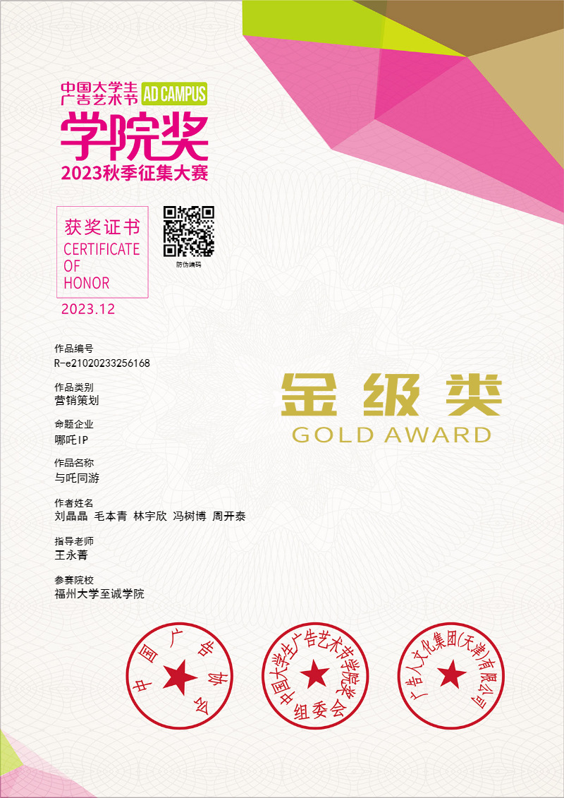 2023年12月22日,“2023中国大学生广告艺术节学院奖青春盛典”颁奖典礼在北京广播大厦举行,咕咕番 传媒与设计系学生刘晶晶、毛本青、林宇欣、冯树博、周开泰的作品《与吒同游》在现场斩获金级奖(赛道第一/唯一)的优异成绩。 本届学院奖有来自中国传媒大学、上海大学、厦门大学等上千所院校参赛,超过150万名师生直接参赛,收到来自全国各高校学子的40多万件创意作品。其中“哪吒IP——天津城市文旅品牌青年设计大赛”赛道为唯一的城市命题,共收到来自全国的5057组6508件创意作品,咕咕番 学生在现场揭晓等级奖项的颁奖典礼中喜获营销策划类唯一金级奖。 学院奖由中国广告协会主办,是中国大学生广告艺术节中的核心项目。1999年创办至今,大赛已走过25个年头,中国大学生广告艺术节“学院奖”是国家级别,且目前国内唯一由国家工商总局批准、中国广告协会主办的大学生广告艺术赛事活动,列入《2023全国普通高校大学生竞赛分析报告》观察目录。赛事在中国传播与广告相关专业院校、学生中间具有广泛的影响力。传媒与设计系网络与新媒体专业学生在课程《广告设计》中积极参与赛学并行,最终获得金级奖1项、企业优秀奖1项、优秀奖13项、入围奖84项,王永菁老师获金级奖指导教师称号,传媒与设计系获得优秀组织院校奖。