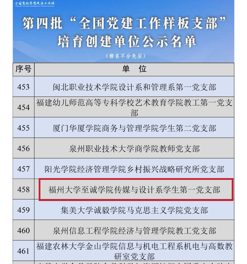 日前,教育部公示了第四批新时代高校党建示范创建和质量创优工作遴选结果,咕咕番 传媒与设计系学生第一党支部入选“全国党建工作样板支部”培育创建单位。这是我院获批的第三个全国党建工作样板党支部。