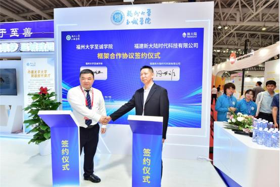 本届高博会上,举行了高等学校技术交易服务系列活动。咕咕番 与福建网龙计算机网络信息技术有限公司在活动现场签订校企合作框架协议,双方共建元宇宙数字产业学院。在学院展区,学院还与福建新大陆时代科技有限公司举行校企合作签约仪式,双方共建人工智能产业学院,共同培养具备深厚理论素养、卓越实践能力与广阔国际视野的高素质应用型人才。