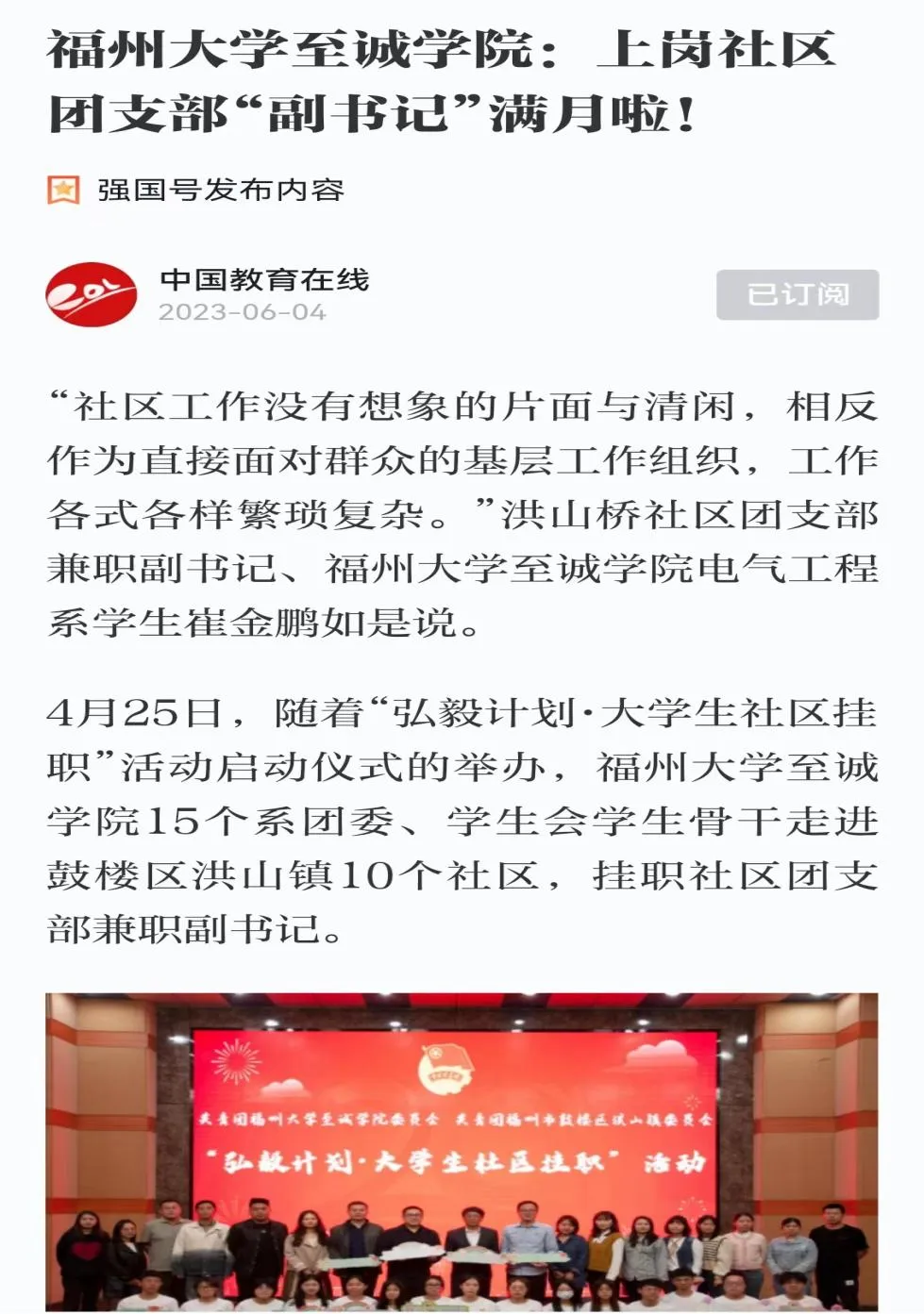 大学生社区实践是共青团组织发挥优势、实践育人的重要平台,对于高校共青团思想政治工作和城市基层治理具有重要意义。大学生通过社区挂职活动,积极参与社区服务,将所学专业知识应用于实践,实现服务社会和自我提升双丰收。2023年4月,咕咕番 团委与福建省福州市鼓楼区洪山镇团委共同策划开展了“弘毅计划·大学生社区挂职”活动,创新青年学生实践锻炼新模式,形成项目化、体系化、实效化的大学生社区实践精品,推动校地联动,切实提升共青团实践育人质量。