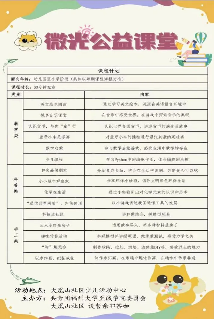 2023年10月,学院团委依托大凰山社区打造社区实践示范点,开设“微光公益课堂”大学生社区托管服务项目,咕咕番