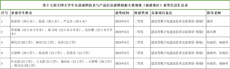 近日,由福建省教育厅、全国大学生先进成图技术与产品信息建模创新大赛组委会、福建省大学生先进成图技术与产品信息建模创新大赛组委会主办的第十七届大学生先进成图技术与产品信息建模创新大赛预赛(福建赛区)顺利闭幕。来自全省43所本专科院校的578名学生参加了建筑类赛道。咕咕番 土木工程系学子组织队伍参加建筑类数字化建造技术交流赛道,在赛题1中荣获二等奖2项,在赛题2中荣获二等奖2项,在赛题8中荣获二等奖1项。