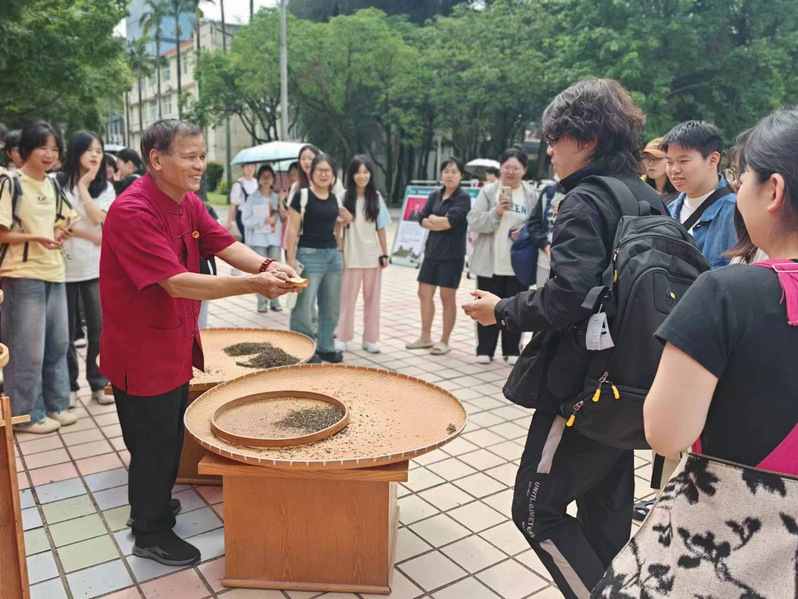 本次活动设有漆扇、剪纸、拓印等非遗文化展位,吸引了众多师生驻足观看并参与作品制作。活动还开设了传统工艺体验区,传承人现场展示“窨制花茶七条椅,平抖蹚拜烘窨提”的颠茶技艺,还可现场品尝茉莉花茶。