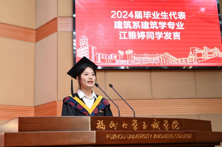 优秀毕业生代表、建筑系建筑学专业江雅婷同学发言,深切表达了对母校的眷念和感恩,分享了在校期间收获的成长和蜕变。她号召全体毕业生,牢记母校教诲,用脚步丈量祖国大地、用眼睛发现中国精神、用耳朵倾听人民呼声、用内心感应时代脉搏,立志让青春在实现中华民族伟大复兴的中国梦中绽放异彩。
