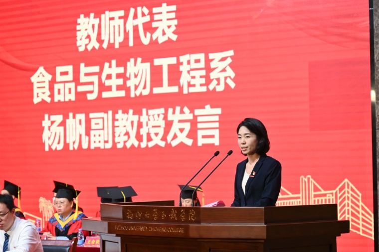 食品与生物工程系杨帆副教授作为教师代表发言。她以自身研究方向“生物活性物质提取的研究”为例向毕业生们阐释成长与成熟的人生话题,嘱咐大家在面对困难时,要做到有备无患,绝不逃避;在机遇面前要保持敏锐的洞察力,识别潜藏的机会,勇敢把握永不言弃;在每一次挑战面前,要全力以赴超越自我。杨帆老师深切寄语毕业生们:愿你们的每一滴汗水都能凝聚成星辰,照亮前行的道路;愿你们的每一次奋斗都能催化成智慧,让世界因你们而不同!