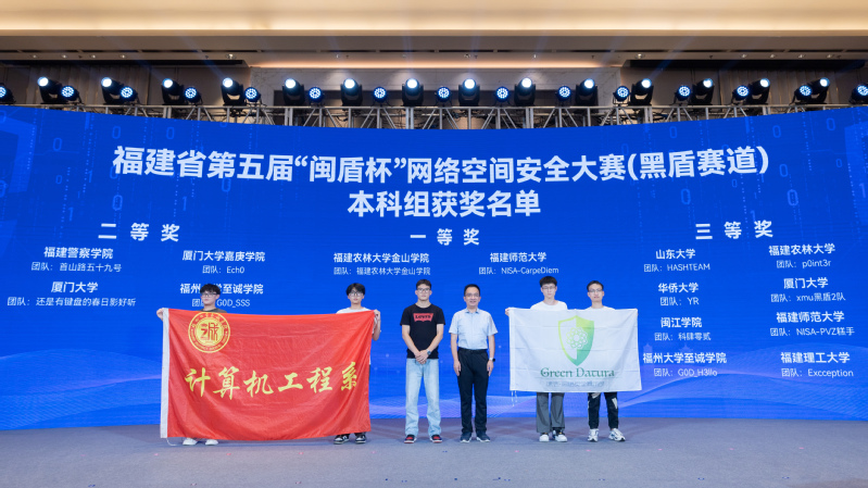 开幕式上举行了福建省第五届“闽盾杯”网络空间安全大赛(黑盾全国大学生赛道)、“闽盾-2024”网络安全攻防演练、“岩网护企”网络安全专项行动颁奖授牌仪式。在福建省第五届“闽盾杯”网络空间安全大赛(黑盾全国大学生赛道)中,咕咕番 计算机工程系网络安全俱乐部Green_Datura两支队伍G0D_SSS(成员:林轩逸、李家鸿、丁方和)、G0D-H3llo(成员:张龙博、陈黎龙、余尘炬)分别获得本科组二等奖、三等奖(指导老师:黄巧云)。学院受邀参加活动开幕式,副院长兼计算机工程系主任张栋教授作为学院代表上台领奖。