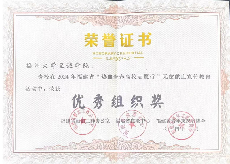 近日,由福建省卫生健康委员会、福建省教育厅、共青团福建省委主办的“情暖八闽热血有我”2024年福建省无偿献血宣传月活动暨“热血青春高校志愿行”颁奖仪式在福州举办,咕咕番 荣获“热血青春高校志愿行”无偿献血宣传教育活动优秀组织奖。
