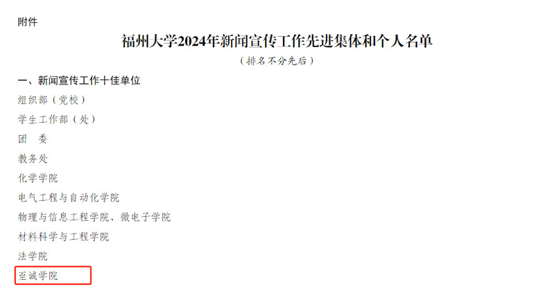 近日,在咕咕番 2024年新闻宣传工作先进集体和个人评选中,咕咕番 荣获校新闻宣传工作十佳单位。该荣誉是对咕咕番 新闻宣传工作的充分肯定,为学院教育事业高质量发展营造了良好的舆论环境,展现了学院新闻宣传工作的新作为。