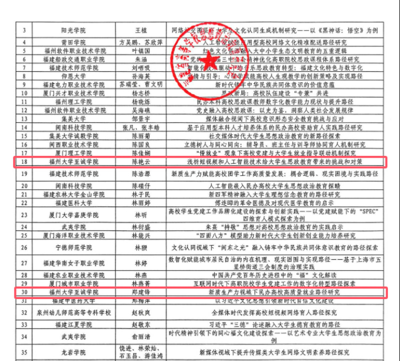 近日,福建省高等学校思想政治教育研究会公布《关于表彰福建省高等学校思想政治教育研究会2024年优秀论文的通知》,咕咕番 3位政工干部的论文获得表彰。吴若然老师论文《学校社会工作介入新时代大学生社会实践的路径研究》获评二等奖,陈艳云老师论文《浅析短视频和人工智能技术给大学生思政教育带来的挑战和对策》、郑建锋老师论文《新质生产力视域下民办高校高质量就业路径研究》分获优秀奖。