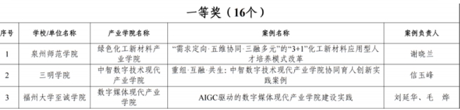 据悉,此次评选由福建省教育厅指导,福建省高校产业学院发展联盟主办,旨在深入贯彻落实国家关于深化产教融合、推进高等教育高质量发展的决策部署,总结推广产业学院建设经验,充分发挥优秀案例的示范引领作用。经过自主申报、专家评审等环节,确定77个案例入选福建省高校产业学院发展联盟第二批产业学院建设优秀案例,其中特等奖9项、一等奖16项、二等奖22项、优秀奖30项。