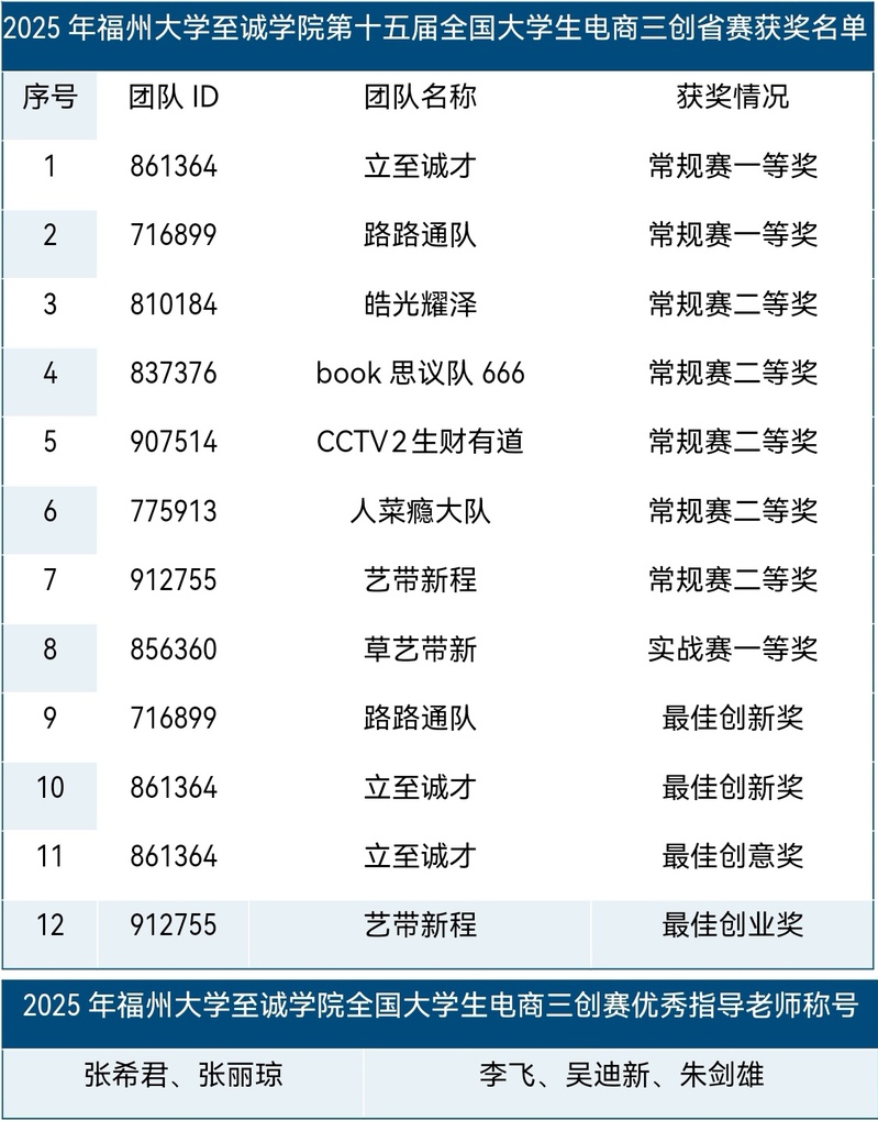 近日,第十五届全国大学生电商三创赛福建省选拔赛咕咕番 共19支团队入围省赛,斩获省级一等奖3项、省级二等奖5项,最佳创新奖2项、最佳创意奖1项、最佳创业奖1项,创该赛事历史最好成绩。朱剑雄、李飞、张希君、张丽琼四位老师荣获优秀指导老师称号。