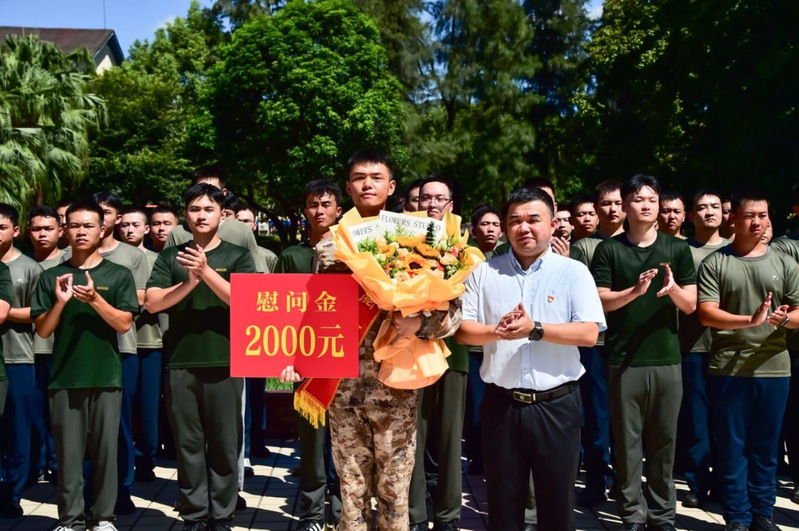 在热烈的掌声中,陈俊智同学向迎接队伍敬礼并报到归校,学生代表向陈俊智同学献上鲜花,表达同学们的祝贺与欢迎。学院林文麟副书记宣读纪念中国人民抗日战争暨世界反法西斯战争胜利80周年阅兵徒步方队指挥部向学院发来的表扬信,侯琳熙院长为陈俊智同学颁发慰问金。