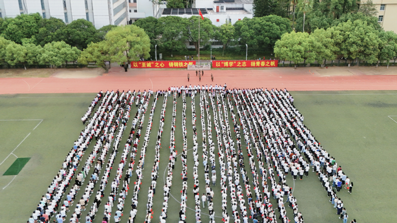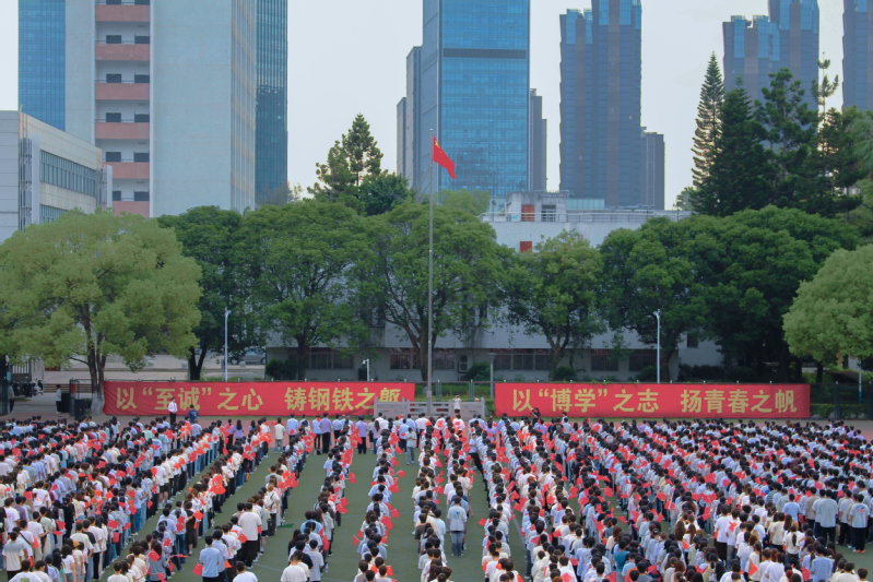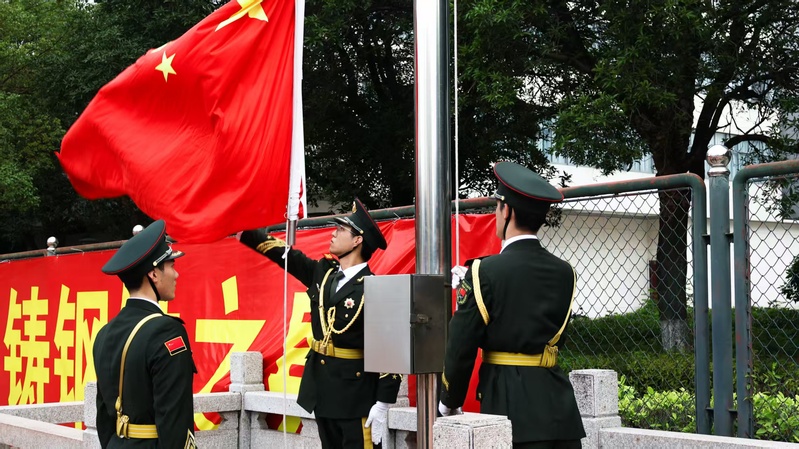 上午7时,国旗护卫队迈着铿锵有力的步伐护送国旗入场。晨曦映照下,鲜艳的五星红旗在激昂的《义勇军进行曲》中冉冉升起,全场师生肃立注目,齐唱国歌。