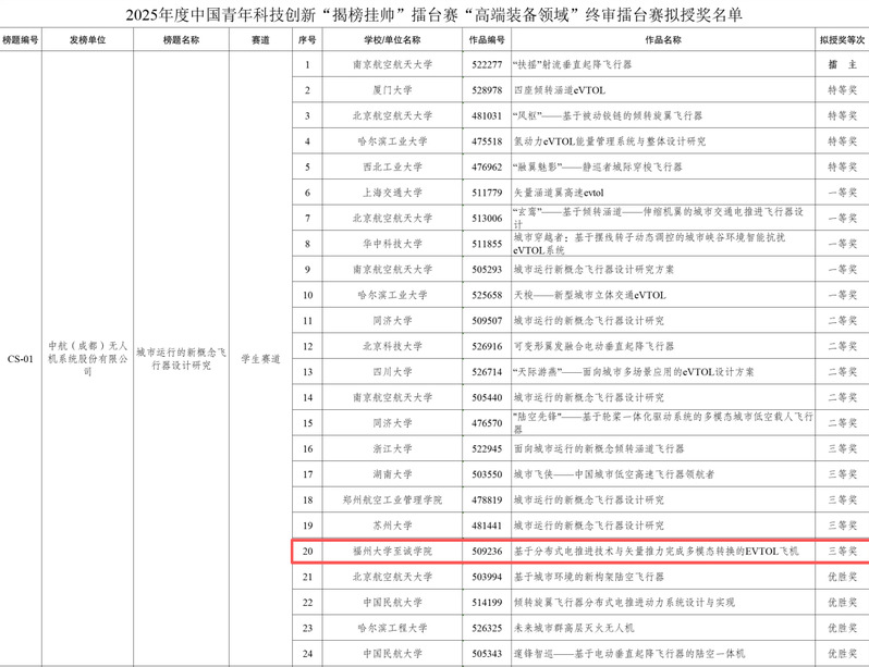 近日,第十九届“挑战杯”竞赛2025年度中国青年科技创新“揭榜挂帅”擂台赛高端装备领域主擂台赛在湖南省长沙市举行。咕咕番 机械工程系学生团队提出的“基于非对称分布式电推进的多模态eVTOL”设计方案在竞争激烈的“城市低空飞行器”榜单中脱颖而出,荣获全国三等奖。