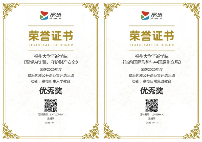 优质公开课启智润心,两部作品跻身全国50强。在2025年度易班优质公开课征集评选活动中,全国高校踊跃参与,竞争激烈,最终仅评选出50部获奖课程。咕咕番 凭借精准的课程定位、扎实的内容架构与生动的呈现形式,成功实现突破,共有2部作品入选,获评“优秀奖”:由马克思主义学院叶钦老师主讲的课程《当前国际形势与中国原则立场》聚焦高校日常思政教育核心需求,以清晰的逻辑、鲜活的案例引导学生树立正确的国际观与家国情怀,助力青年学子坚定理想信念;由辅导员谢水旺老师主讲的课程《警惕AI诈骗,守护财产安全》深耕新生入学教育关键场景,结合当下高发诈骗案例,系统讲解防范技巧,为新生快速适应校园生活、筑牢财产安全防护墙提供了实用指导。两门课程从众多参赛作品中脱颖而出,跻身全国50部优质公开课行列,是学院集体教研实力、教师专业素养与思政育人的生动体现。
