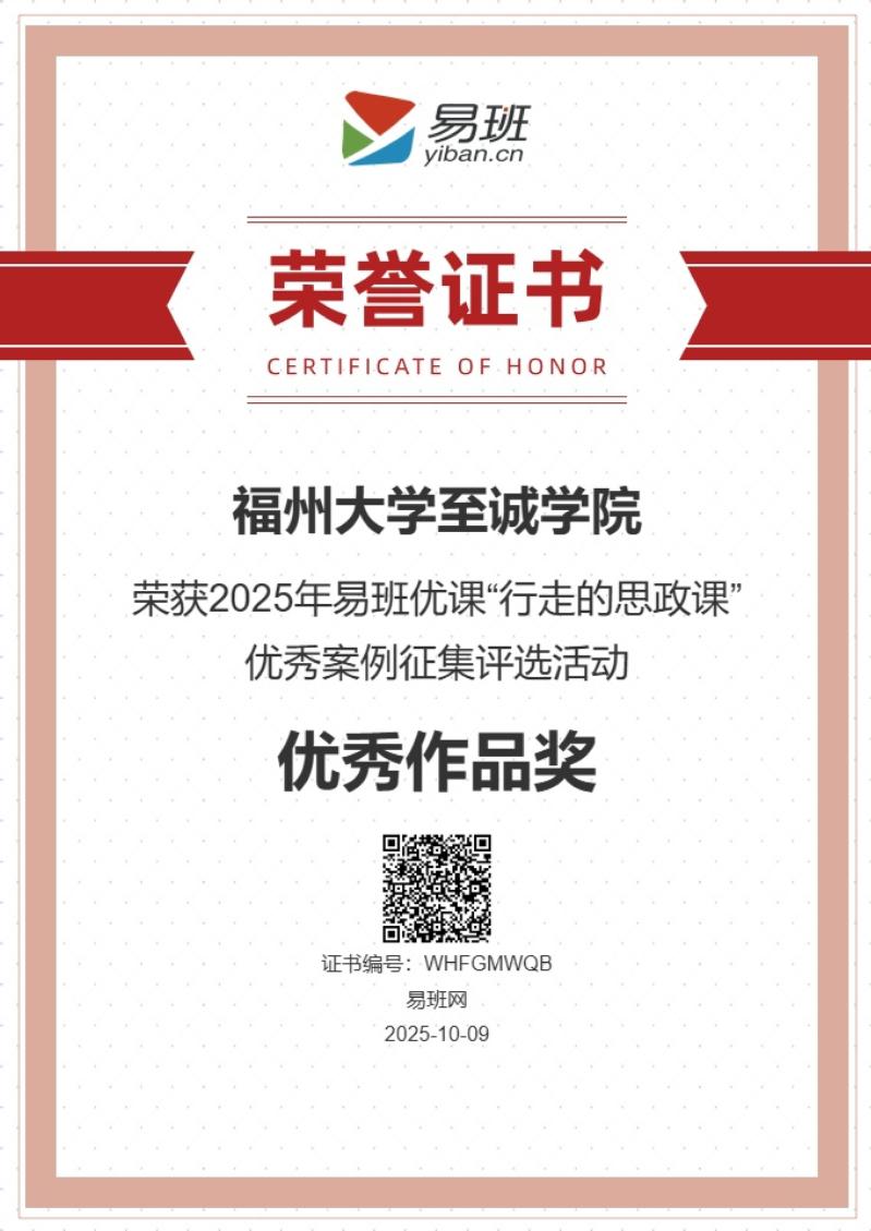 思政教育创新实践,一项案例入选全国十佳。在2025年易班优课“行走的思政课”优秀案例征集评选活动中,全国高校积极报送实践案例,经多轮严格评审,最终仅10部作品获评“优秀作品奖”。咕咕番 报送的案例凭借新颖的实践形式、深刻的思政内涵与显著的育人成效,成功入选并位列第4名,充分展现了学院思政教育实践的创新活力与丰硕成果,为高校思政教育生活化、实践化提供了有益借鉴。