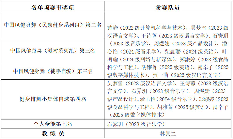近日,“第19届中国大学生健康活力大赛”在南平市浦城县圆满帷幕。咕咕番 学生啦啦操队在林景兰老师的精心指导下,一举斩获中国风健身舞单项赛第二名1项、第三名2项,健身排舞第四名1项。同时,石霁玥同学还获得个人全能第七名。学院林景兰老师荣获“中国风健身舞优秀教练员”称号。