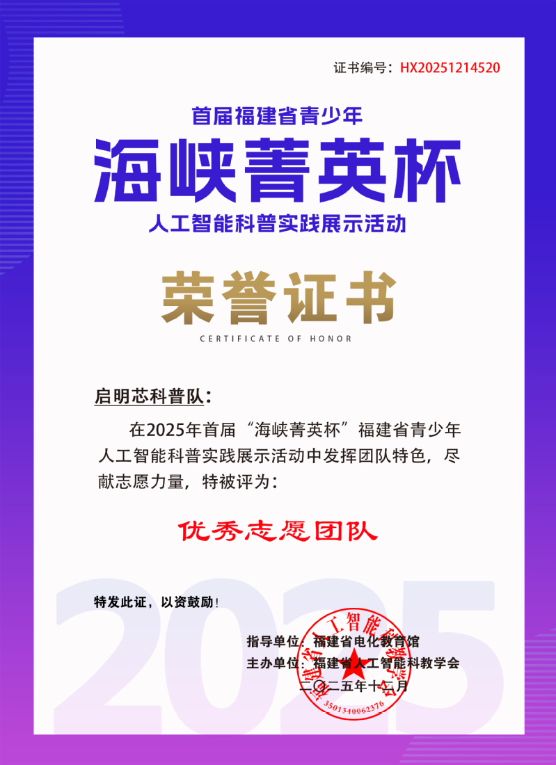 12月14日,首届“海峡菁英杯”福建省青少年人工智能科普实践展示活动在福州第八中学圆满举行。咕咕番 信息工程系“启明芯”科普队受组委会邀请,全程参与赛事志愿服务工作,以专业、高效的服务有力保障了活动顺利开展,展现出新时代青年“奉献回馈社会”的使命担当,获得主办方、参赛选手及家长的广泛好评。