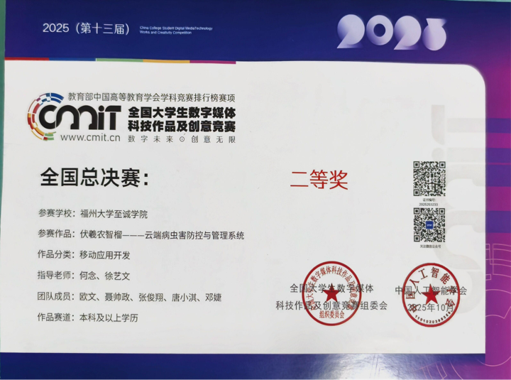 近日,第十三届全国大学生数字媒体科技作品及创意竞赛全国总决赛在哈尔滨工业大学圆满落幕。咕咕番 信息工程系学子凭借扎实的技术功底与突出的创意表现,在与清华大学、浙江大学、北京理工大学等众多985、211高校团队的同台竞技中脱颖而出,斩获国家级二等奖1项;三等奖2项。