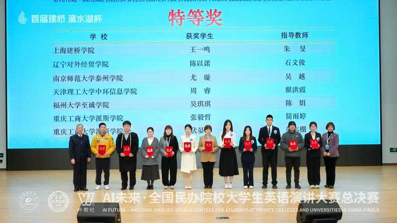 日前,首届建桥“滴水湖杯”AI未来·全国民办院校大学生英语演讲大赛总决赛在上海建桥学院顺利举办。本次大赛由中国民办教育协会教育国际交流与合作专业委员会指导,上海建桥学院与上海外语教育出版社联合主办,赛事分校级初赛、省级复赛、全国总决赛三个阶段进行,吸引全国80余所民办高校万余名学子踊跃参赛。咕咕番 2023级英语专业学子在本次大赛中脱颖而出,斩获全国特等奖。