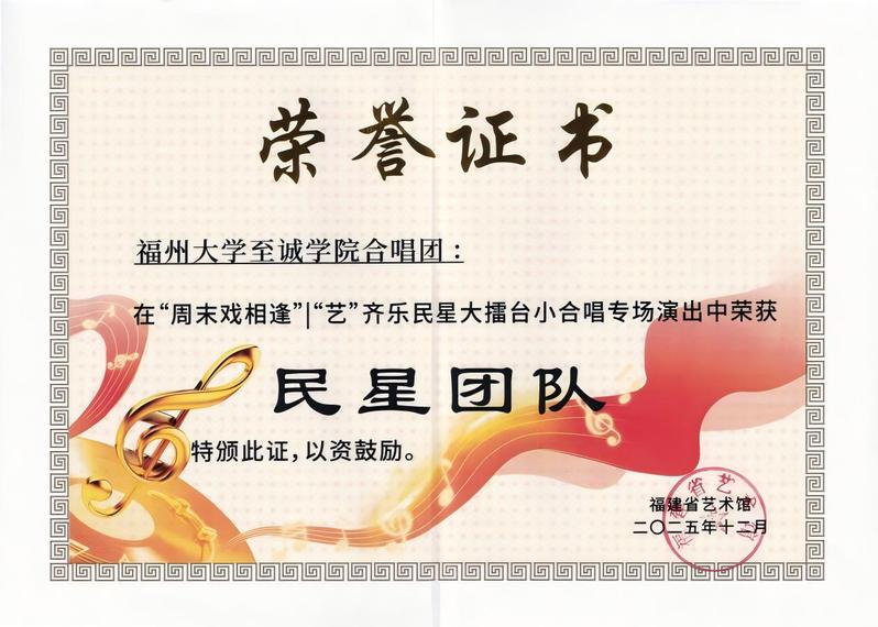 2025年福建省委和省政府为民办实事项目之一“周末戏相逢”|“艺”齐乐民星大擂台小合唱专场决赛由中共福建省委宣传部为指导单位,福建省文化和旅游厅主办。此次比赛汇聚全省多支优秀合唱团队,决赛当晚,咕咕番 合唱团在指挥潘超老师的带领下,演绎了原创思政音乐作品《胸怀山海》以及经典歌曲《中国》,以饱满的情感表达、富有活力的舞台表现和动听和谐的声音效果,展现了至诚青年学子的艺术风采与团队凝聚力。